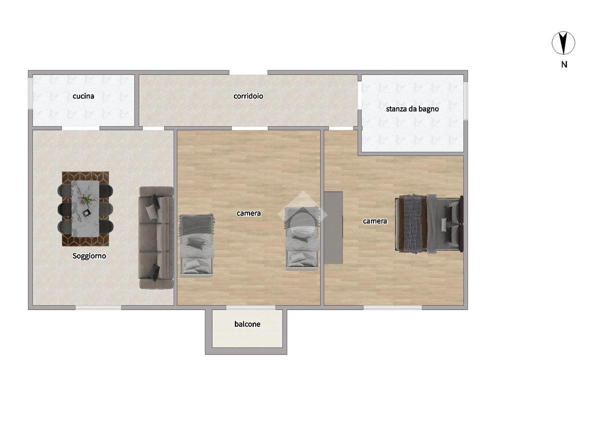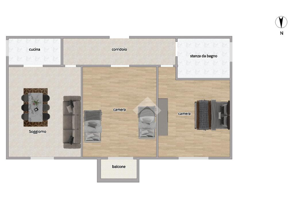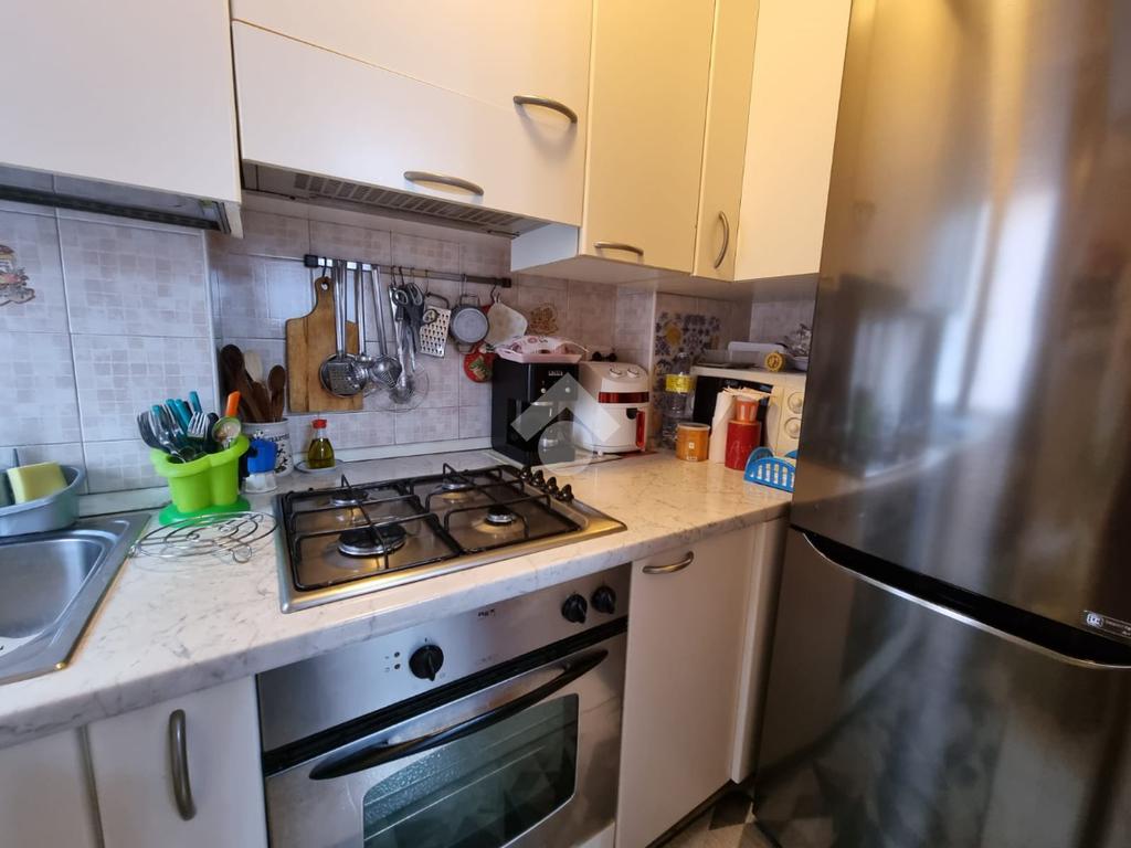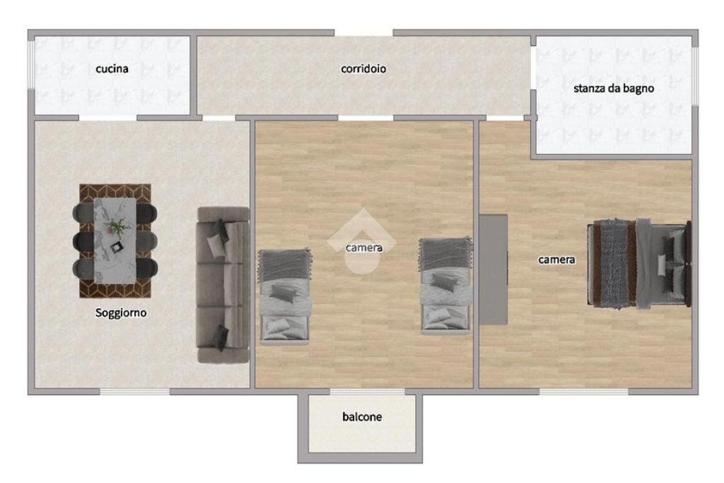 Ci accoglie un corridoio d'ingresso dove sulla destra troviamo la zona giorno con soggiorno e cucinotto, la zona notte è invece composta da due camere da letto, una delle quali accessoriata di balcone e bagno, finestrato, con vasca.