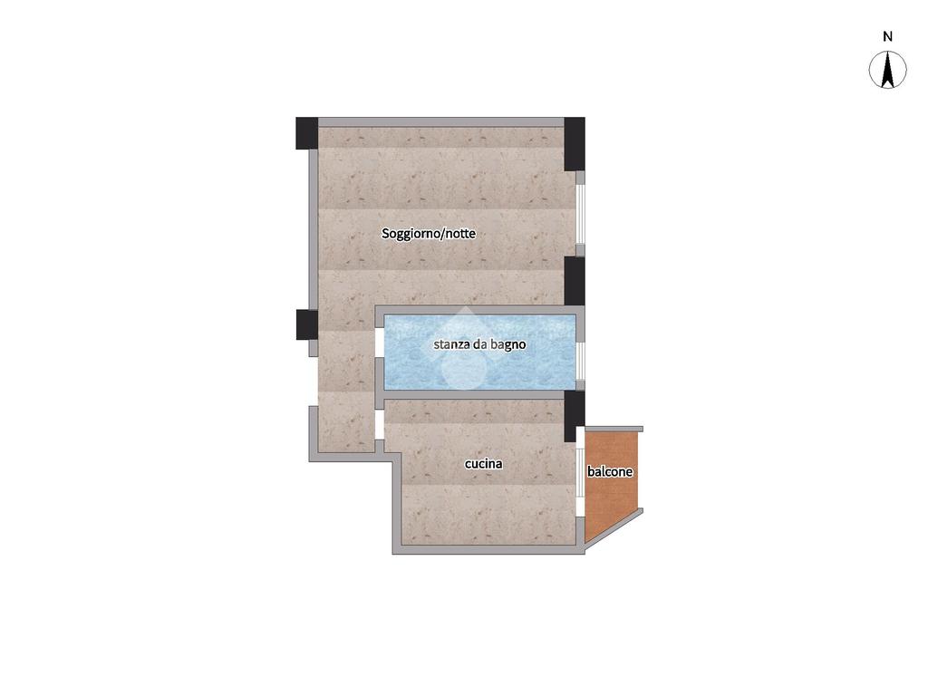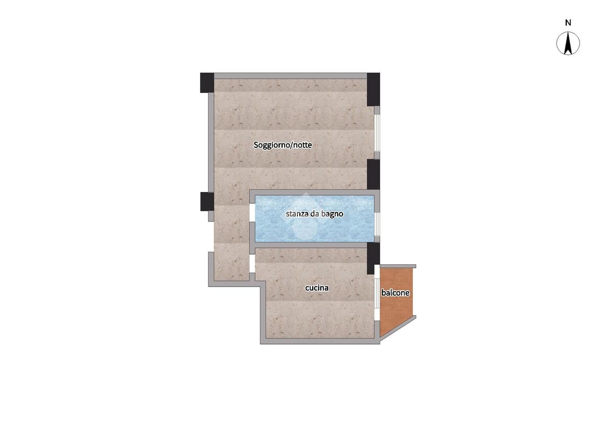 Ci accoglie un ingresso dove sulla sinistra si trova la camera/soggiorno, successivamente bagno finestrato con doccia e cucina abitabile accessoriata di balcone.
